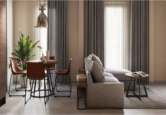 Полезная площадь распределена рационально. Вид из окна открывает красивую панораму. Форма помещений продумана до каждой детали. В стиле оформления используются натуральные материалы.