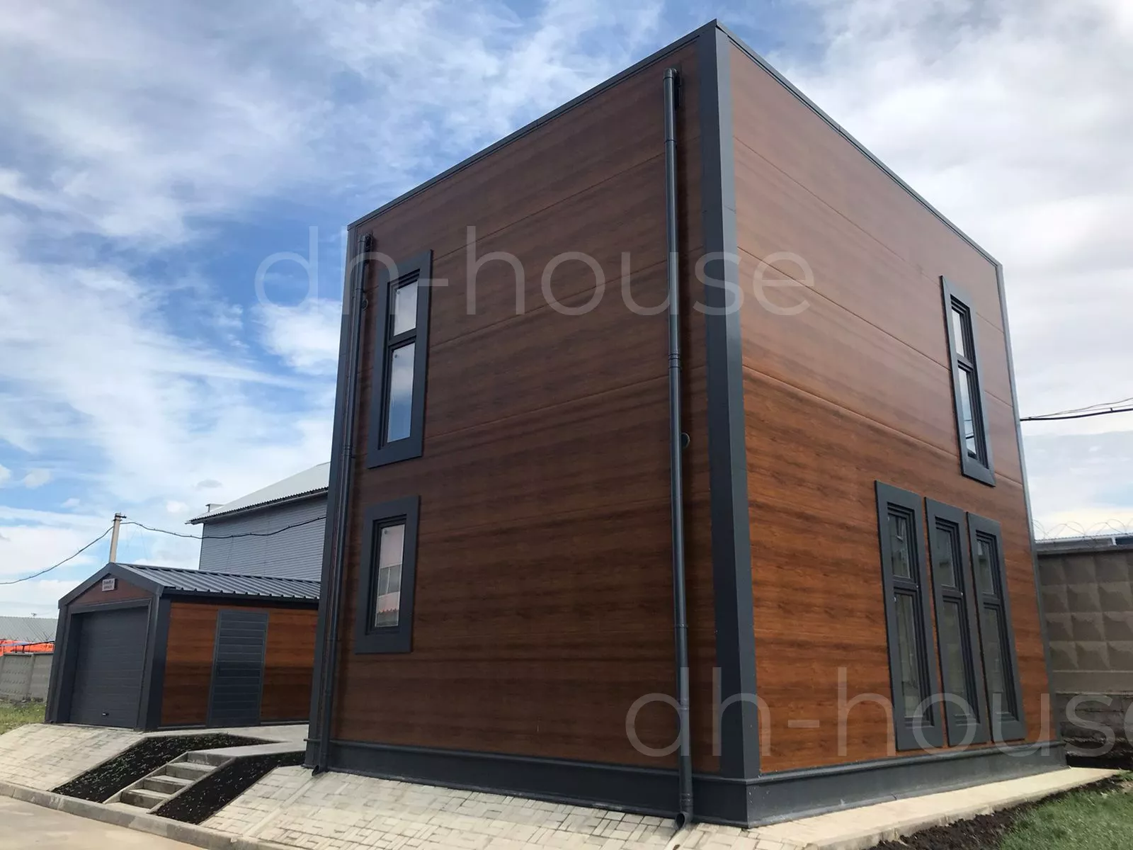На первом этаже размещена гостиная, совмещенная с кухней, спальня, санузел, а на втором — две комнаты для отдыха, санузел и гардеробная. По желанию заказчика в планировку могут быть внесены изменения. Использование передовых технологий при строительстве двухэтажного модульного дома гарантирует комфортное круглогодичное проживание семьи из 3–4 человек.